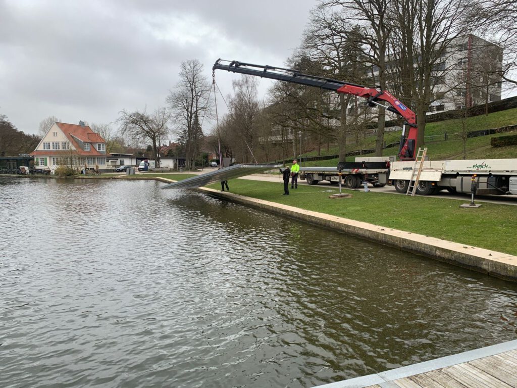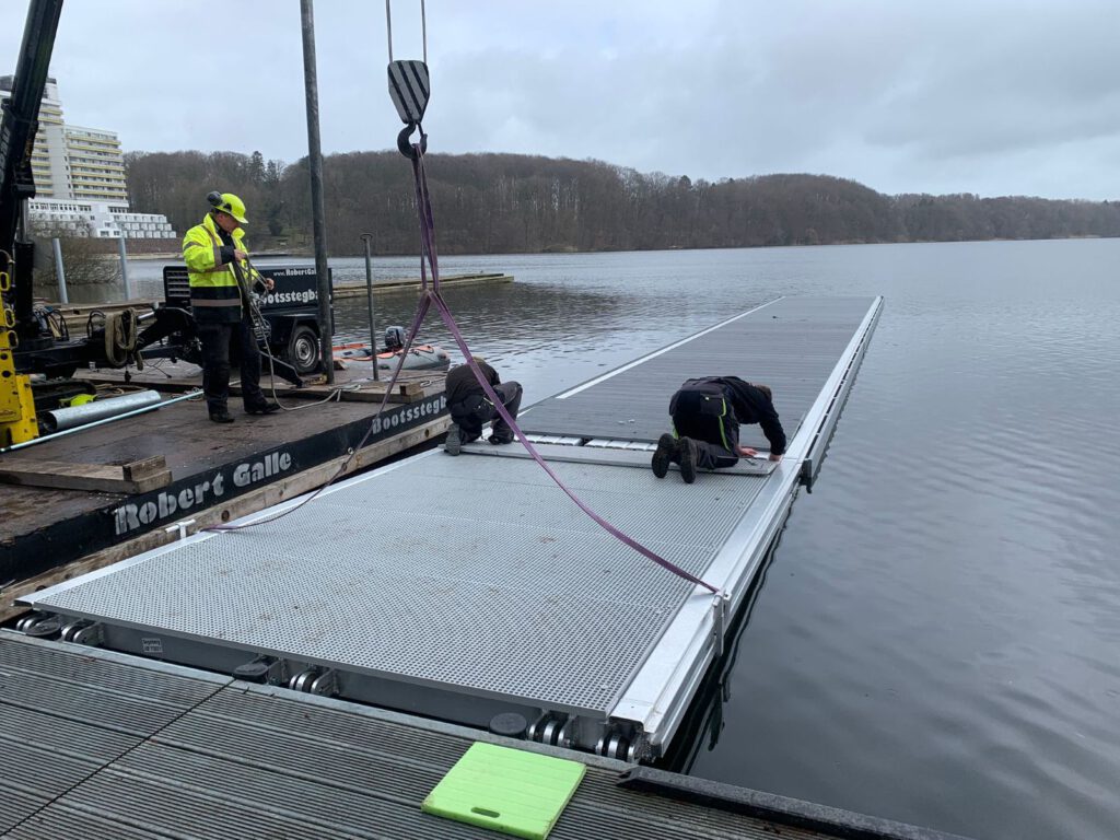 Der neue Schwimmsteg besteht vollständig aus Aluminium und wurde in mehreren vorgefertigten Segmenten per LKW angeliefert und anschließend mit einem Autokran zu Wasser gelassen.