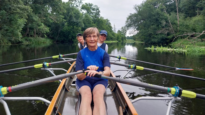 Am Samstag machten wir uns dann zu Fuß auf dem Weg vom Quartier zum Kanuclub. Dort wurden wir bereits erwartet und durften uns über die Unterstützung der Kanuten beim zu Wasser lassen unserer im Verhältnis zu den Kanus doch wesentlich größeren Boote freuen. In die Boote mussten wir hier über Wasser einsteigen. Die Tagesetappe startete mit dem Überqueren des Bützower Sees und mündete in einen kleinen Kanal, der uns zur Warnow führte. Von dort ging es flussabwärts mit nur wenig Strömung durch herrliche Wiesenlandschaften zu unserem Mittagshalt an einem Campingplatz in Schwaan. Dort durften wir den Ruderboot-tauglichen Steg, der eigentlich den Anglern vorbehalten war, nach Rücksprache mit dem Platzwart in Beschlag nehmen. Weiter führte uns unsere 36 km-Etappe schließlich zum Olympischen Ruderclub Rostock nach Kessin. Hier ist auch der Leistungssport Mecklenburg-Vorpommerns mit kompletter Infrastruktur wie Athleten-Unterkünften und diversen Bootshallen auf einem sehr gepflegten Gelände beheimatet. Dieser Standort mit einem tollen Ruderrevier würde sich auch für ein Trainingslager unserer Rennruderer anbieten. Der ORC Rostock hat sogar eine eigene Bushaltestelle: Von hier gings mit Bus und Bahn zurück nach Bützow. Das Abendessen schmeckte nach der langen Ruderetappe nochmal so gut wie am Vortag.